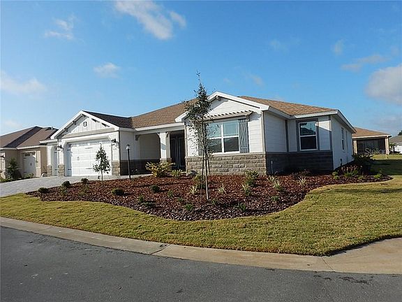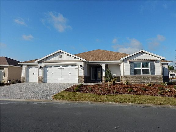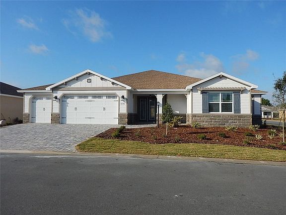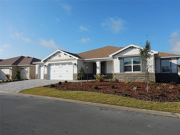 Gorgeous Wellington model home, with 3 bedrooms, 3 bathrooms, and a 3 car garage! This inventory home with owners' entry, is located in Sanctuary. The covered entry with pavers and double doors makes for a grand entry into the foyer. There is crown molding surrounding all the main areas. As you walk down the foyer and to the right, the hallway leads you to the large 3rd bedroom, and guest bathroom with quartz counter and step in tub. Next is the flex room that can be a den, office, or library! To your left, the owner's entry and laundry room is centrally located for your convenience. The kitchen has wonderful features: stainless steel appliances, staggered cabinetry, tile backsplash, Cambria quartz counters, and a huge island! The dining room, along with the spacious great room (with tray ceiling), and the kitchen make for a wonderful family and entertaining space! There is 24" x 24" ceramic tile that is set on the diagonal throughout the home with plush carpet in the bedrooms. This special home has 2 master suites! The 1st suite has a walk-in closet, and master bath with quartz counter and walk-in shower. The 2nd master suite is grand in size with a huge rectangular walk- in closet, with a master bath that has a double vanity sink with quartz counters and a spacious walk-in shower with bench. Step out to relax on your lanai with a cool beverage and enjoy! Located in Ocala's premier, gated, active 55+ community, loaded with amenities, including golf cart access to two shopping centers.
