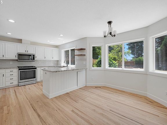 This Tualatin home has been thoughtfully updated to feel bright, open, and inviting, with a neutral color palette and custom finishes throughout. The kitchen features open shelving, a built-in desk area, and both a cozy nook and formal dining space. French doors lead to a main-level office, while the spacious primary suite includes a tray ceiling, double vanity, and relaxing soaker tub. Upstairs, vaulted ceilings add charm to one of the bedrooms, and outside you'll find a flat, fenced yard perfect for gathering or play.