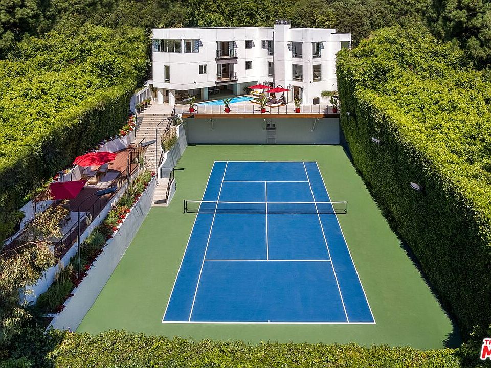 Set behind gates in the exclusive Bird Streets, Warbler Way is a .57-acre tennis court compound where architectural sophistication meets resort-style living. Bold and timeless, this modern masterpiece blends luxurious comfort with sleek design and total privacy. Walls of glass frame sweeping views of the hills and city skyline, while natural light floods the open interiors finished in new organic modern wood floors and curated details throughout. The 4-bedroom residence spans 6,200 square feet with an open-concept layout that includes a gourmet kitchen with Sub-Zero and Viking appliances and an elegant center island, a dining area, and an expansive living room. Amenities include a 12-seat movie theater, full gym, game room with locker and steam, office, maid's quarters, and an additional lower-level family room. A detached guesthouse features a private entrance, walls of glass showcasing sweeping views, and a full kitchen and bath perfect for visitors, extended stays, or a serene retreat. The grounds are designed for effortless entertaining, showcasing lush new landscaping, dramatic lighting, a resort-style pool with streaming fountains, BBQ deck, outdoor fireplace, and a newly resurfaced tennis court with lights for night play. Parking includes a 3-car garage plus ample room for 5 additional cars, and 2 guest parking spots above. Just off Doheny and the Sunset Strip, and moments from Beverly Hills, this gated estate is a rare offering an architectural sanctuary where design, luxury, and location converge at the height of Los Angeles living.