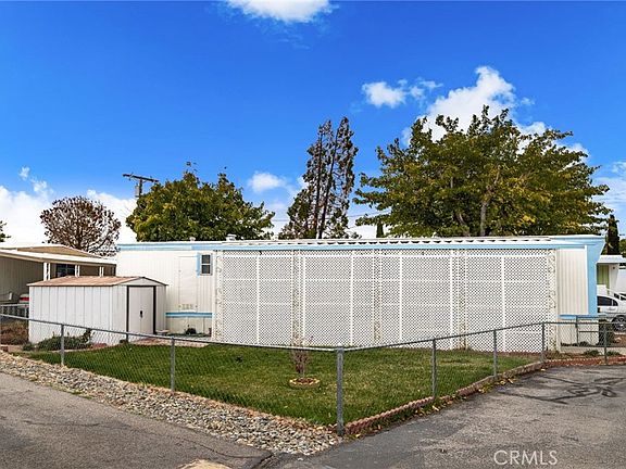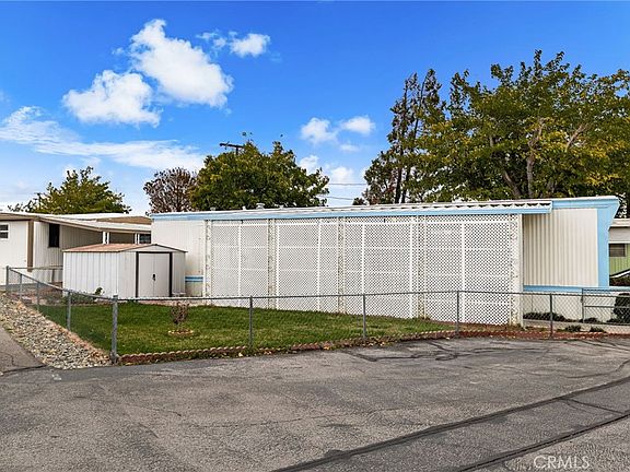 Affordable turnkey home in in the quiet Juniper Senior Park! This two bedroom home is as comfortable as they come, with recently updated kitchen and bathroom. Enter in through a enclosed patio, great for your potted plants and morning coffee lounging. A spacious living room includes a wall mounted swamp cooler which keeps the home nice and cool during those summer months. A pass through takes you to the recently updated kitchen complete with newer sink and dishwasher. Down the hall sits the recently updated bathroom with accessibility features such as a walk in shower and sink with hand holds. Indoor laundry is offered within the bathroom with laundry hookups adjacent to the shower and additional storage above for all your laundry needs. Lots of privacy in each bedroom, as they sit at opposite ends of the home. The primary bedroom enjoys it's own wall mounted AC unit for added nighttime comfort. Windows throughout the home have been recently replaced, home has also been earthquake braced and sewer line has been replaced. This corner lot space enjoys a larger yard space then it's neighboring homes. A large gated lawn space is great for a pet (check with the park for breed restrictions). Excellent location, a walkable distance to Stater Bros Market and local dining and shopping.