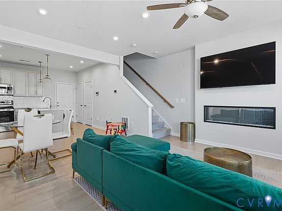 The bright white kitchen opens seamlessly to the living room, creating an ideal space for entertaining. A sleek wall-mounted fireplace adds warmth and character to the main living area. LVP flooring flows throughout, providing both durability and a clean, modern look.