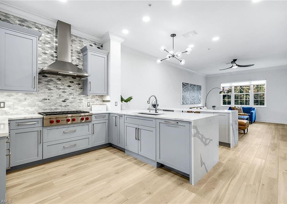 One of a kind Stunning Coach Home that has been RENOVATED and UPGRADED. Step outside onto a space where you will enjoy spectacular long lake views with southern exposure, perfect for all day, indoor and outdoor living. The interior unfolds with CoreTec waterproof luxury plank flooring throughout, illuminated by LED lighting, followed by the fully reimagined kitchen, equipped with a Thermador Refrigerator, Double Oven, Dishwasher, and Wine cooler, complemented by a Wolf Range, silver marble backsplash, a fully costumed kitchen cabinetry with built-in rollout shelving and electrical outlets, quartz countertops, and dual waterfall-edge islands a showpiece for entertaining and daily living. The primary suite is a complete retreat, upgraded with automatic drapes, custom closets, and a spa-inspired bathroom. Enjoy the glass-enclosed shower with dual niches, a soaking tub framed by a feature wall, quartz counters with his-and-her sinks, and Toto toilet. Large sliding glass doors invite natural light and open the room to the balcony, bringing in spectacular water views . From the great room, sliding glass doors lead to the expansive balcony overlooking shimmering water views, while the second bedroom features a Juliette balcony, adding charm and elegance. The guest bath and laundry room have been tastefully updated with quartz finishes, Washer And Dryer, while crown molding, designer lighting, a sleek new Stair Rail, and custom-built closets in every bedroom add to the home’s refined character. Practical upgrades ensure complete peace of mind: a NEW tankless water heater (2024), freshly painted interiors, building with a NEW ROOF, updated gutters, and fresh exterior paint. The residence is complete with a private garage featuring a 2023 motor and built-in shelving,Unique location with extra guest parking just outside, and an ELEVATOR shaft ready and prepped for installation. At Fiddler’s Creek, world-class amenities await resort-style pools, fine dining, spa, fitness, tennis, pickleball, and championship golf all just minutes from Marco Island and downtown Naples. This home is more than upgraded; it’s been perfected. Every finish, every view, every detail invites you to experience luxury living at its finest.