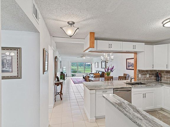Welcome to 9244 Flynn Circle, a beautifully updated 2-bedroom, 2-bathroom home offering a perfect blend of modern luxury and serene lakefront living. Step into the newly renovated kitchen, where you'll find stunning marble countertops complemented by a stone backsplash, double sinks, and top-of-the-line stainless steel appliances. The white Shaker cabinets, equipped with slow-close features, add both elegance and convenience. Enjoy breathtaking, lake views from your screened back porch, featuring a durable tile floor--an ideal spot for relaxation. The home boasts hard surface flooring throughout, ensuring both style and ease of maintenance. Additional features include ceiling fans in every room, all-new modern interior doors, and a recently updated full-house plumbing system (2023). The home also offers a one-car garage with a newly installed motor, and a double-long driveway for ample parking. This home is located in a Town Villas community with a low HOA fee, which includes cable, internet, and lawn care. Residents enjoy access a range of amenities, including a pool, shuffleboard, tennis courts, bocce ball, a card room, a billiard room, a sauna, and a gym. Don't miss the opportunity to make this lakefront gem your own!