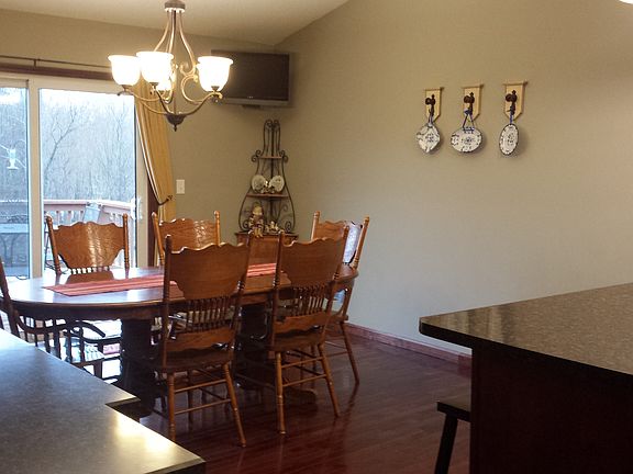 Home, built in 2008, is situated on 5 acres, has a creek that runs through the rear of the property. About half is timber and half is mowed. 2984 sq. feet, 1658 on the main floor, and 1326 finished in the walkout basement. 4 bed and 3 baths. Main floor boasts maple hardwood floors in the kitchen, dining room, great room and halls; utility room and bathrooms have tile floors, and the bedrooms have carpet. Utility room has washer/dryer hook ups and a sink with lots of storage cabinets. Master bedroom has walk in closet, master bath has dual vanity sink and a large shower. The three other bedrooms have large closets, and all have ceiling fans. The great room has a gas fireplace with granite surround and maple mantle. The fireplace is prewired for a flat screen tv to hang above it. The kitchen has large storage areas with pull out storage in the cabinets and a walk in pantry. The kitchen is equipped with 2 ovens and a flat top stove, side by side refrigerator, disposal, microwave, and dishwasher. All appliances are energy star, colored black and are included. The dining room is large with plenty of room to spare, also this room is wired for a wall mounted tv as well. The walkout basement was finished in 2010. It includes a full bath, large bedroom, entertainment room, and recreational area. The entertainment room is prewired and equipped with ceiling mounted speakers and a full surround sound. There is about 332 sq. feet of additional storage in the remaining basement space. The full finished and insulated garage is 24x24 with an additional storage area of 8x8, it has a large 18x7 door with electric opener. There is storage above the garage that is accessed by pull down steps in the garage. The house also offers a 12x20 ft. wood deck, it was stained in 2011. The full walkout basement has a 12x48 ft. concrete patio running the length of the house. Electric conduit and water supply are installed for future garage or shed at south end of the house. 200a electric, aerator septic system, buried propane tank for heat, fireplace, and 2 water heaters (propane and electric). Has high efficiency heat and AC. R-49 ceiling insulation, low E and argon filled windows. PRICED REDUCED TO $259,900. Washer and Dryer are negotiable. For sale by owner. Can be seen at 9244 Rezy Road., Staunton, IL. In Staunton School District. Call 217-248-8271 for more info.