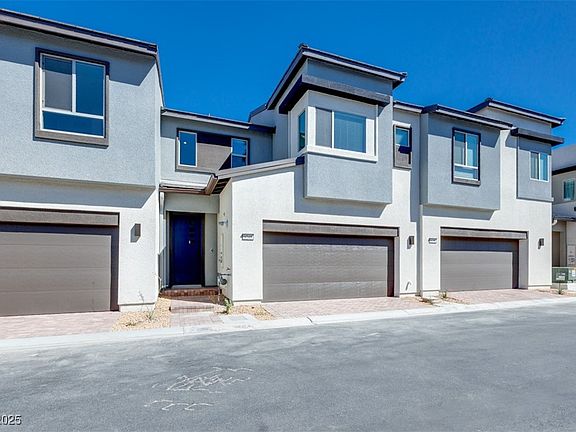 Options, financing, and closing costs incentives available. Speak to on-site sales agent for details. Modern brand new two story home. Welcome to this stylish 2-bedroom 2-bathroom townhome in Skye Canyon. This modern home blends contemporary design with functionality. The impressive 2-story foyer greets you with natural light and high ceilings. The living space offers a relaxed great room next to a dining area, perfect for entertaining or casual meals. Upstairs, boasts two primary suites with attached bathrooms and walk in closets. The newly landscaped, low-maintenance backyard offers a peaceful outdoor escape. With an attached 2-car garage and modern amenities, this townhome embodies the best of Skye Canyon living.