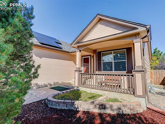 Comfortable and Updated Ranch Home with Paid-Off Solar, Class 4 Roof, and a Flexible Floor Plan! Enjoy main-level living in this beautifully updated 4-bedroom, 3-bath home tucked on a quiet street close to parks, shopping, and D20 schools. A welcoming front porch sets the tone for this inviting property, perfect for morning coffee or relaxing evenings. Step inside to a bright, open layout featuring new flooring upstairs, fresh interior paint, and a kitchen updated with new granite countertops, stainless steel appliances, and plenty of cabinet space. The vaulted ceilings and open flow between the living and dining areas make the main level feel spacious and connected. The main floor offers two bedrooms, including the primary suite with a walk-in closet and private bath, along with a secondary bedroom that works great as an office or guest room. The new upstairs windows fill the home with natural light while improving energy efficiency. Downstairs, enjoy a huge family room, perfect for movie nights, games, or gatherings plus two additional bedrooms, a full bath, a laundry area, and extra storage. The layout offers flexibility for guests, hobbies, or work-from-home space. Outside, the fully fenced backyard features a large storage shed, mature landscaping, and plenty of room for pets, gardening, or outdoor entertaining. The Class 4 impact-resistant roof and paid-off solar panels provide long-term durability, energy efficiency, and peace of mind. Additional highlights include a newer water heater, central air conditioning, and an attached two-car garage for added comfort and convenience. Located near the Powers corridor and quick access to major routes, this home combines thoughtful updates, low-maintenance living, and unbeatable value in one of Colorado Springs’ most convenient areas!