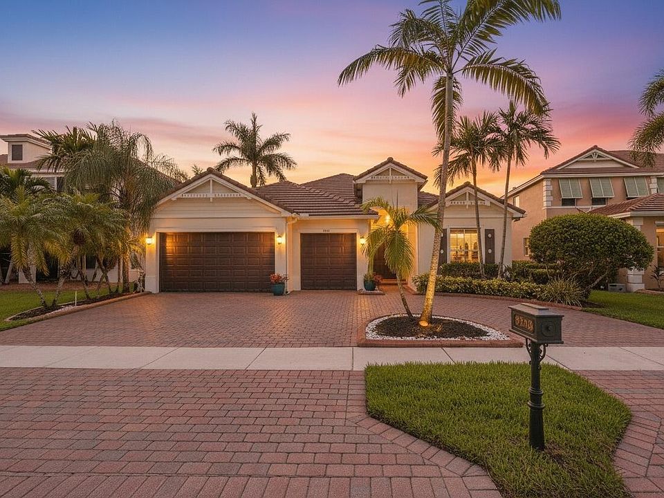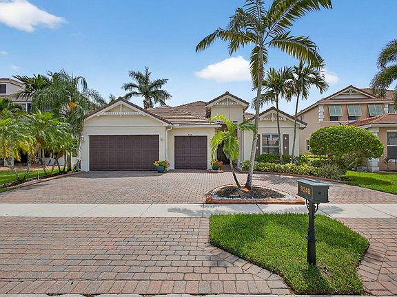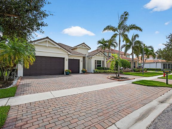 Welcome to this impeccably maintained 5 bedroom, 3 bathroom, 3 car garage estate, ideally situated on a private cul-de-sac in the exclusive Bay Tree enclave of Palm Beach Plantation in Royal Palm Beach, Florida. This elegant lakefront residence offers a private pool, tranquil water views, and exceptional curb appeal with a circular brick-paver driveway, manicured tropical landscaping, and an oversized garage. Recent upgrades include a 2023 roof, 2 A/C units installed in 2021, and a hot water heater from 2015. The roof was professionally power washed in July 2025, reflecting the home's meticulous upkeep and move-in-ready appeal. Designed for elevated South Florida living, the home features a spacious open-concept layout with soaring ceilings, elegant archways, and sleek porcelain tile throughout the main living areas. Double doors open to a grand foyer with tray ceilings and a decorative tile inlay, setting the tone for the refined interiors beyond.
