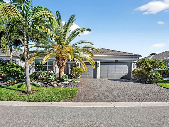 Welcome to this stunning 3-bedroom, 3-1/2 bath 3 car gar. waterfront home rolling greens private view. property boasts professionally landscaped front and features a modern open floor plan with high ceilings and 24x24 upgraded porcelain tile. The kitchen is equipped with upgraded white cabinets, soft close doors and SS appliances and quartz countertops, customized shades throughout with impact glass windows and doors. Extended private patio overlooking the water. This home is located in a desirable community with resort-style amenities, including3 poola, tennis courts, 11 pickleball courts and a 40000 sf clubhouse in a resort style setting. Enjoy camp like living in this magnificent active adult community with full service restaurant, clubs, Broadway like shows in 500 seat social hall!