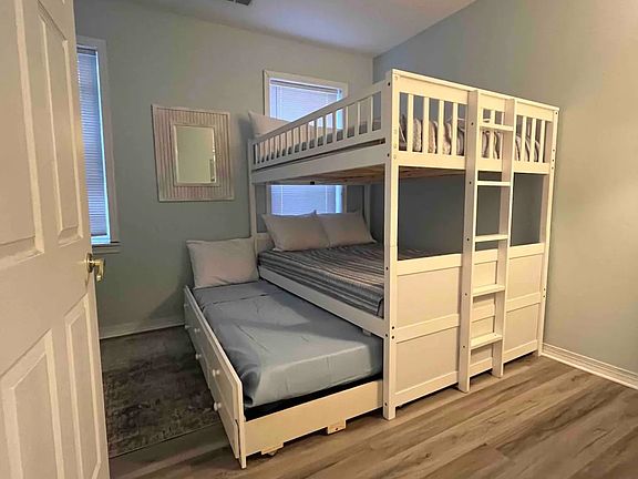 Fully furnished with a king size bed in primary bedroom, full over full bunk beds with twin trundle in second bedroom.