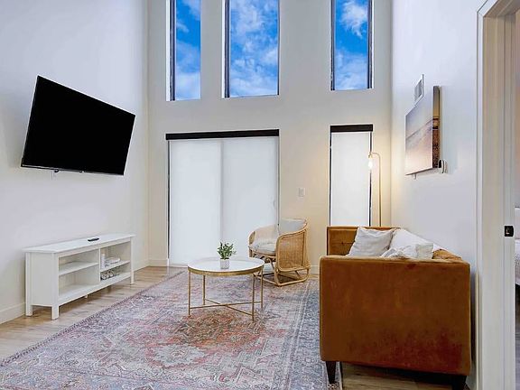 The kitchen is equipped with stainless steel appliances, including a dishwasher, and features custom cabinetry with elegant quartz countertops. Convenience is at your fingertips with in-unit laundry and smart home features such as a doorbell and thermostat.