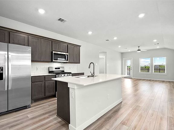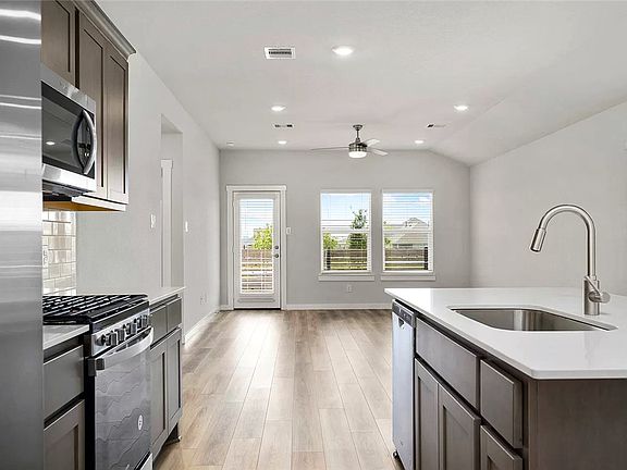Nestled in the serene Midtown Reserve, 925 Kickapoo Ln is a charming residence boasting three bedrooms and two bathrooms. The cozy living space is illuminated by natural light, seamlessly flowing into the dining area, perfect for gatherings. The modern kitchen is a chef's haven, while the master bedroom offers a tranquil escape. You will find the kitchen and baths finished with taupe wood-look flooring, espresso shaker style cabinetry, white-quartz countertops, and subway tile backsplash. Stainless-steel kitchen appliances and brushed nickel fixtures add fresh accents to the rental home. A washer and dryer are located in the utility room. Surrounded by lush landscaping, this property provides a peaceful outdoor retreat. Conveniently located near schools and amenities, it offers both comfort and accessibility, making it a great choice for your next rental home.