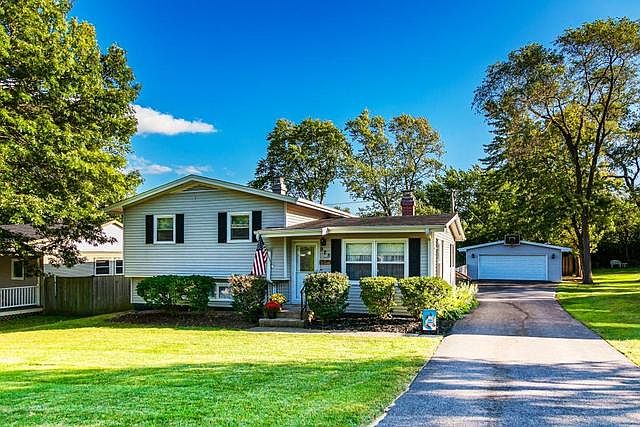 Lovely 3/4 Bedroom 2 bath Trilevel located on huge 1/4 acre lot in private Loch Lomond lake subdivision. Step into the cozy Living room with fireplace, neutral carpet (owner states hardwood floors underneath) and built in shelves. Country kitchen with hardwood floors, wood cabinets, appliances and sliding doors to deck and backyard. 3 bedrooms up with neutral carpet (owner states hardwood floors underneath). English basement Lower level with new carpet features bonus bedroom/den, family room, built in desk/ shelves, bath with shower, and laundry room with walk out to yard. Lovely fenced yard with deck and 2 car detached garage. Updates include new driveway ('18), furnace and humidifier ('14), Trusty Warnes back up sump pump. Loch Lomond is for residents only with 2 private beaches for swimming, boating, fishing. Close to shopping, schools, parks, restaurants and EZ access to highway and Metra. A honey for the money! Seller is looking for end of October closing. Shows great!