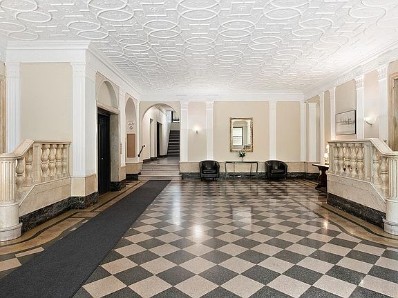Enjoy a spacious living room that can comfortably accommodate an L-shape sofa plus work-from-home desk. A recently renovated eat-in kitchen features stainless steel appliances and granite counters. The king-size bedroom allows for a complete furniture set. The windowed bathroom was recently updated. Four closets! Tall windows and high ceilings make the whole space feel even larger. Situated four steps up from the grand lobby, this peaceful apartment is essentially a full flight up in the rear of the building with no pedestrian or traffic noise.
