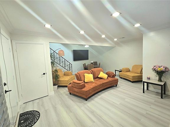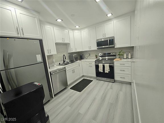BEAUTIFUL GEM! This tastefully remodeled 1-bedroom, 1.5-bath condo is designed to maximize space and comfort. It features luxury vinyl flooring, a bright kitchen with custom white cabinets and stainless steel appliances, modern recessed lighting, a spacious bedroom with a customized spacious closet plus a handy office nook. Enjoy your own enclosed patio perfect for relaxing or hosting friends and its large additional storage to house your busy lifestyle tools. Community amenities includes: two sparkling pools, tennis court, and clubhouse. HOA fees already includes landscaping, water, and trash. Property is Conveniently located near shopping, dining, and with easy access to Summerlin Parkway and Hwy US-95. This home combines convenience and charm. Don’t miss this opportunity!