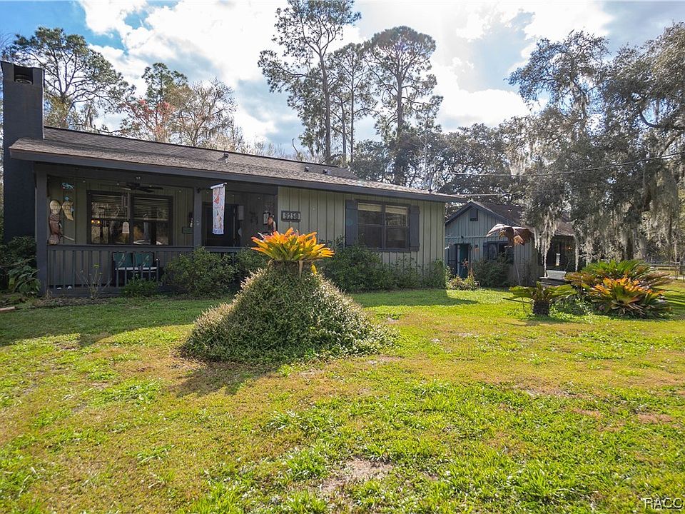 TURN KEY POOL HOME, UPDATED TO THE MAX! A prime location in the Nature Coast. Minutes from downtown Inverness, and a stones throw away from the Withlacoochee River. Proudly boasting a new roof in 2022, Updated A/C and Halo system in 2019. Fresh paint inside and out. All new window shades throughout. 8' x 16' built-in front porch area with a sunshade, outdoor ceiling fan, and wood railing. Luxury ceramic tile planking through out. Vaulted ceilings in the main living area. Wood burning stone finished fireplace, with thick finished wood mantle in the living room. Updated kitchen cabinets, with buffet style extras offering additional counter space, and a full built in pantry. All counters are smooth finished solid granite with soft quarter round shaped edges. Tongue and groove accent wall above the white ceramic tile backslash. Uppers are custom hung rustic solid wood shelving to make storage easily accessible and visible for efficient selection. Deluxe stainless steel appliance package. Spacious Master suite with a nice views of the yard. Full master bath with updated vanity, fixtures, and updated tile surrounding the tub and shower area. Indoor laundry area hidden from sight with bi-fold doors, and built in shelving for extra utility storage. Additional fully updated guest bath with walk in shower. Head out the back to the climate controlled porch area overlooking the outdoor 12' x 14' wood patio, and 22' x 53' pool area. The 2019 screened in salt water pool boasts a 6 person heated in ground spa, with a waterfall. Concrete walkway leading from the pool area over to the 22' x 32' detached garage. Garage is split into the workshop/parking area with two grade level roll up doors, and a finished area that is currently set up to accommodate additional guests. Manicured yard includes exquisite landscaping, and various fruit trees. Canal out back leads to the river. The Turner Camp public boat ramp access is right around the corner. Deals like this are few and far between! Make it yours today!