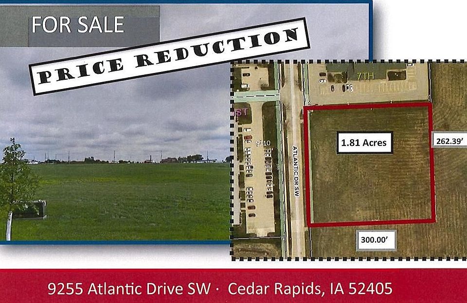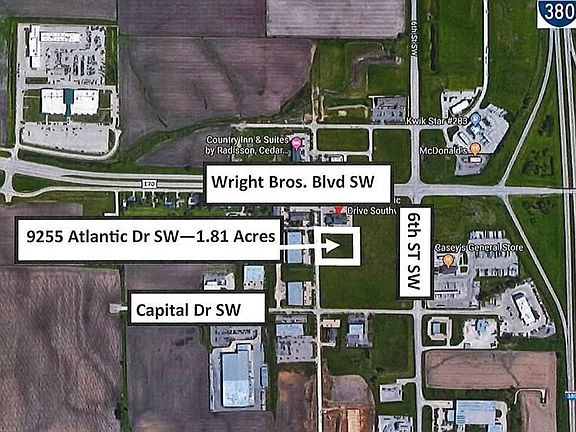 PRICE REDUCED! Prime commercial development ground in SW quadrant, with S-MR zoning - C-3 in former zoning system. Approximately 1.81 acres, to be determined via survey. Adjacent to I-380 at Exit 13. 52,600 cars per day. Also near the Eastern Iowa Airport, with all utilities to the site.