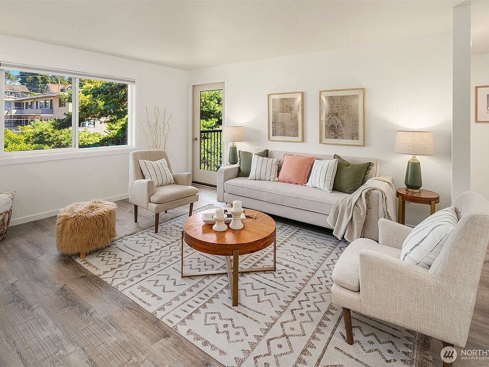 Welcome to this completely updated, top floor, corner condo in the heart of vibrant Greenwood! This fantastic condo truly has all the right spaces including plenty of storage. The living space is bright & open w/woodburning fireplace, views of large evergreen tree which evokes a sense of privacy & treehouse vibes. Some other features include the ensuite primary bdrm with 3/4 bath + large closet, the second bdrm has access to the balcony, plus there's an actual laundry room which is rare! Enjoy the new Trader Joes just blocks away, all the Greenwood shops/eateries + new designated bike lane in front of complex. The exterior has been updated/refreshed & the new elevator is going to be installed soon. This cute urban condo is a must see!