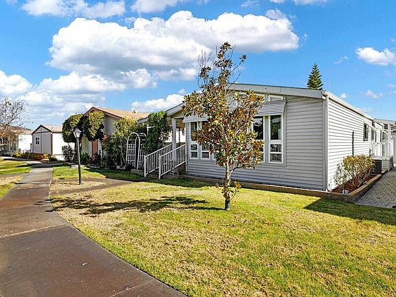 Don't miss this opportunity to own a charming home in the desirable 55+ park of New Frontier! This well maintained manufactured home was built in 1983 and is perfectly situated on the greenbelt for easy access to the acres of walking paths. This 2-bedroom, 2-bathroom home has vaulted and beamed ceilings which create an open and airy feel throughout. The wood-burning fireplace serves as a cozy centerpiece in the spacious living area, complemented by wood floors that flow seamlessly through the home. The updated white kitchen features granite countertops, wine fridge and a breakfast bar. The large dining room features a china cabinet and desk which offers both style and functionality. A dedicated laundry room has washer and dryer hookups and provides access to the side yard which leads to your 2 car garage. Step outside to enjoy the mature landscaping and the large side deck, perfect for relaxing or entertaining. Additional highlights include a 2-car garage, new hot water heater, ample storage, and a serene location that balances nature with modern comforts. This community offers so many wonderful activities like indoor shuffleboard, coffee and donuts, horseshoes, tennis, pickleball, aqua class, bunco, plus there are two pools, two indoor spas, a computer room, club house, library, putting green, game room, billiards, community room and wonderful events throughout the year. New Frontier is beautifully landscaped with acres of greenbelts and walking paths. Additional conveniences offer car wash area and RV storage (fee). Buyer needs park approval. There's a one pet per residence policy and there's no paws on the pavement.