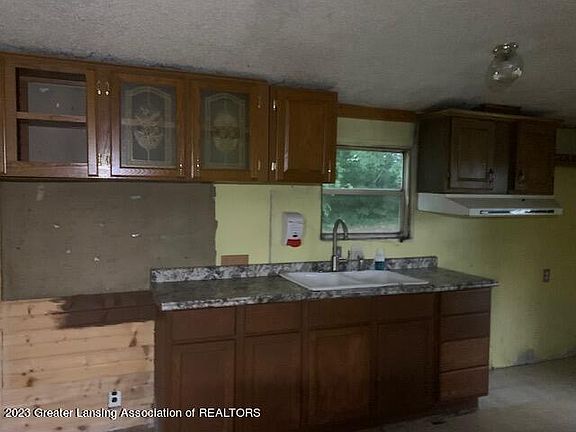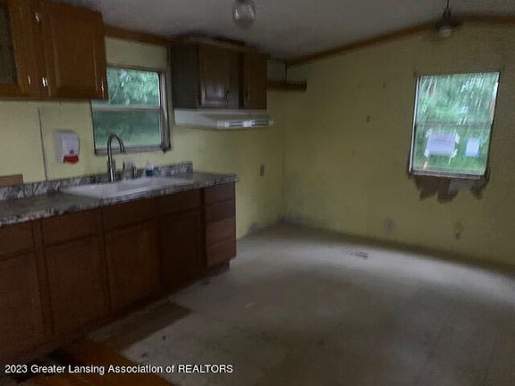 Nice rural setting with many trees on a paved road in the county. There is a detached building for storage. Open floor plan for the kitchen and living room.