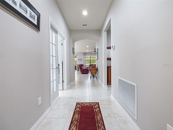 Welcome to this beautifully maintained Abbeyville model in the sought-after 55+ community of Del Webb Stone Creek. This 2-bedroom, 2-bath home with a versatile flex room offers both comfort and style. Tile flooring flows seamlessly throughout the home, complementing the open floor plan. The spacious kitchen is a true centerpiece, featuring a large granite-topped island, perfect for entertaining. Both bathrooms include elegant tiled walk-in showers, while the primary suite boasts a custom closet organizer for maximum storage. Step outside to your private retreat where a screened-in lanai with pavers extends to a paver patio with a charming pergola, creating the perfect outdoor entertainment space. Thoughtful landscaping adds privacy and enhances the serene setting. This move-in ready home combines functionality, style, and a resort-style lifestyle in one of Ocala’s premier active adult communities.