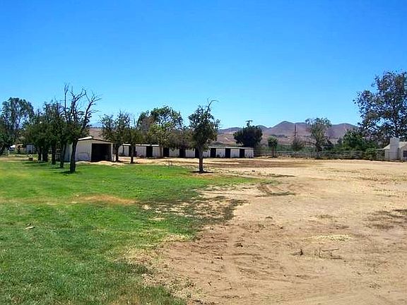 Horse Ranch Jurupa Valley / Pedley Area home on 2.39 acres flat, square horse property. 3 barns with 25 stalls, arena, round pen set up for horses. Corner lot with over 600 ft of road frontage. Barns and house on outside edges of property with lots of open space. Easy access for oversize vehicles. Hidden Valley Wildlife Area (Santa Ana River Bed) right across the street with lots of trails for riding. Golf course just 3 houses away.