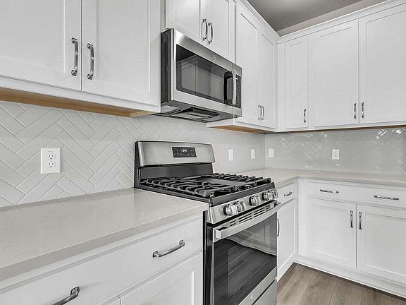 Brushed nickel fixturesStainless steel appliancesWide-plank lvp flooringCovered patioBar seatingWhite cabinets
