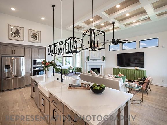 This stunning one-story home by Highland Homes offers an open layout designed to impress w/ stunning 13-foot ceilings throughout—perfect for wowing your guests! The chef-inspired kitchen boasts sleek quartz countertops, and ample seating for entertaining. Gorgeous wood flooring flows throughout the main areas of this home, while the primary suite serves as a retreat. The extended outdoor patio is a great place to enjoy the tranquility of your back yard. Still have to time to personalize with our design team! Make an appt today.