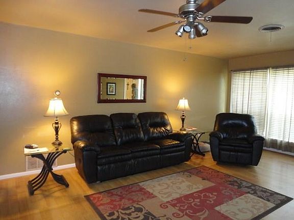 Lovely three bedroom, two bathroom frame home near High School; Split bedroom arrangement; Combination kitchen and dining room with two pantries, ample cabinets, counter workspace and vinyl floor; Large den with laminate flooring and a wall of windows; Carpet in the bedrooms; The extra wide hallway has built-ins storage cabinets; CH-A and hot water heater, gas; The master bedroom adjoins a large walk-in closet including the utility room; Bedrooms 2 and 3 have adjoining bathrooms; Chain-link fenced backyard with 10' x 9' metal storage building; All kitchen appliances convey to Buyers at closing and funding