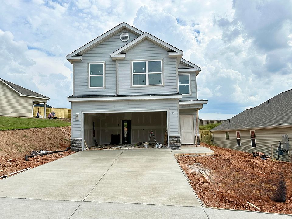The Riverton 2 floor plan is presented by Bill Beazley Homes. This is a 4-bedroom, 2.5 bathroom open concept home with a large in eat kitchen/dining area with island and GE stainless steel appliances. The great room features an electric fireplace, and there is plenty of storage and mud room right off the garage entrance. The primary bedroom is located on the upper level and features double vanities, quartz countertops, framed mirrors, garden tub and semi seamless shower doors. There are 3 additional bedrooms on the upper level with walk in closets. Other interior features include tray and vaulted ceilings, Evacore click flooring in all main living area. Low E-Insulated double pane windows, and a tankless water heater. For added security and convenience, the home is equipped with an Interlogix Smart Home/Security System, structured wiring using CAT6 and RG6 wiring, and a programmable Smart thermostat. WCFIBER offers the fastest internet service. Enjoy the neighborhood's resort-style pool with a pavilion, Activity Field, and Paved Recreational Trails. Plus, this home's location is incredibly convenient, with easy access to Fort Gordon, Medical Districts, Aiken and Augusta, and I-20. The builder is offering an 8,000 incentive that can be used towards closing costs, upgrades, or to buy down the interest rate.