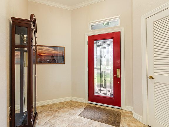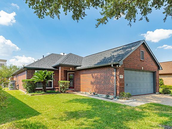 Welcome to this beautifully maintained all-brick single-story home with timeless curb appeal. A stately shade tree, fresh landscaping, and a freshly painted 2-car garage door create a warm and inviting exterior. Inside, a striking red front door opens to a bright entry with tile floors, crown molding, and high ceilings. The spacious family room features vaulted ceilings, updated wood-look laminate flooring, and natural light. The kitchen offers granite counters, solid wood cabinets, stainless appliances, and a sunny breakfast area with bay window views. The primary suite is a true retreat with vaulted ceilings, a walk-in closet, and a spa-inspired bath featuring dual sinks, a soaking tub, and a separate shower. A secondary bedroom with full guest bath provides flexible space for guests or an office. Enjoy the fully fenced backyard with a covered patio—perfect for relaxing or entertaining outdoors. Roof 2025, Water heater 2021, updated windows, gutter, root barrier