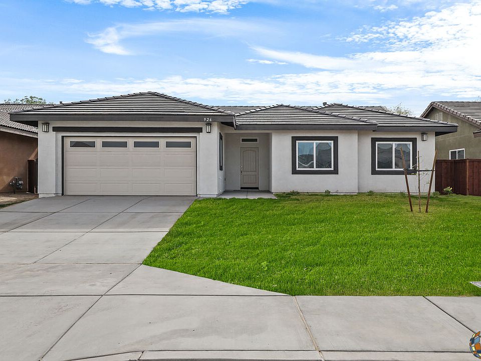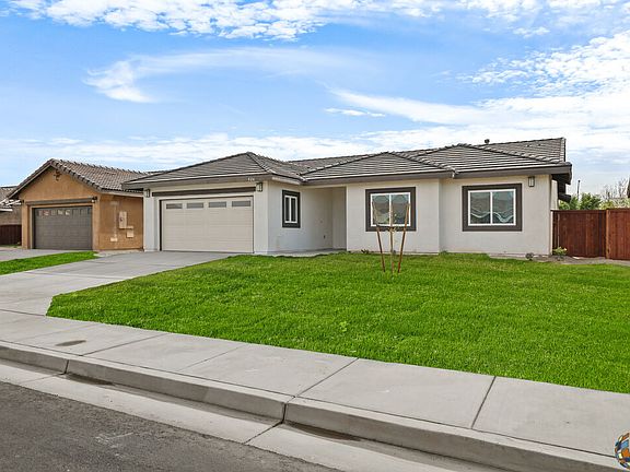 This brand new, single story home in Brawley is sure to impress. This great room opens to the dining and kitchen with a powder room for guests. Shaker cabinets and quartz countertops provide an elegant, modern look. Stainless steel appliances include a stove, microwave, and dishwasher. The primary bedroom has a large walk-in closet and en suite bath with dual modern sinks and hardware throughout the house. Updated floorings include ceramic tile, designer carpet, and custom tile floors. The front yard is landscaped with grass and drought-tolerant plants that are watered by an automatic drip system. Furthermore, this home offers extended energy savings compared to homes of similar age due to its new construction status. It is within short distance of shopping, dining, entertainment, Pioneer Medical Center, and schools which makes it ideal for anyone who loves convenience! Interior photos are of model homes; this one will be ready for closing within 30 Days!