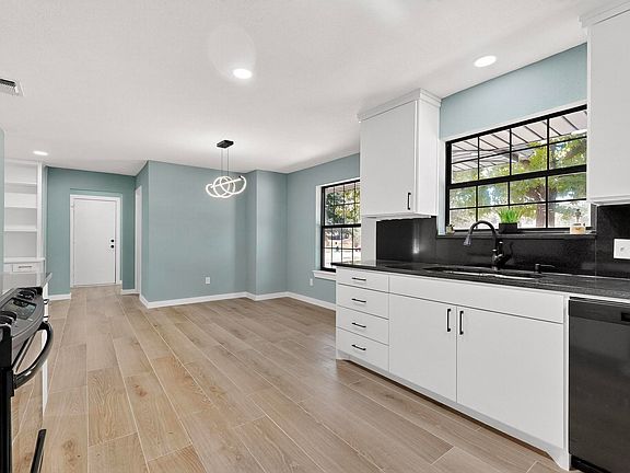 Situated on a corner lot right across from a park, this home features a bright open layout with fresh paint, new light fixtures, and luxury vinyl plank flooring throughout. The kitchen includes sleek white cabinets, black granite countertops, and stainless steel appliances. A bold black tile fireplace adds a stylish focal point to the main living room with vaulted ceilings.