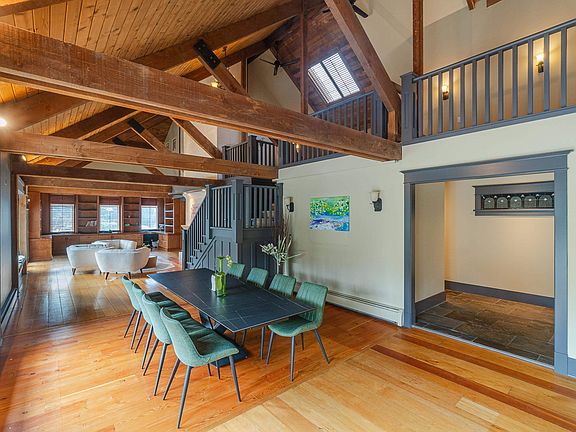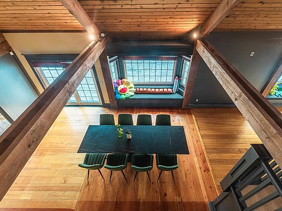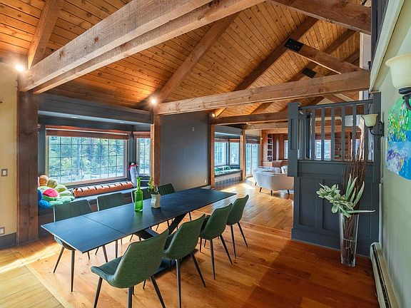 High vaulted woodbeam ceilingGrandeur architectureElegant windowsCalifornia shuttersNatural pondTree land
