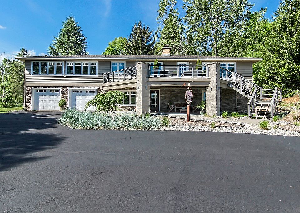 Accepting Backup Offers Raised ranch with attached, oversized 2-car garage, nestled on 13.5 acres (divisible), all within 4 miles of downtown Traverse City. A secluded oasis providing much privacy and abundant open space, along with glimpses of West Grand Traverse Bay. From the top of the acreage, stunning views of the bay. This home features an open concept main level with master bedroom with on suite bath, two additional bedrooms, additional full bath, office, kitchen, dining room, family room and living room featuring a stone fireplace with gas insert. Multiple windows provide much natural light. The interior of the home has been recently painted in a contemporary, neutral palette throughout. The lower level offers a bedroom with egress window, three-quarter bath, exercise room/dance studio, pantry, dedicated laundry room with abundant storage, and a recreation room with a large wood burning stove. Large windows provide natural light and this level has a separate entrance providing multiple user options.