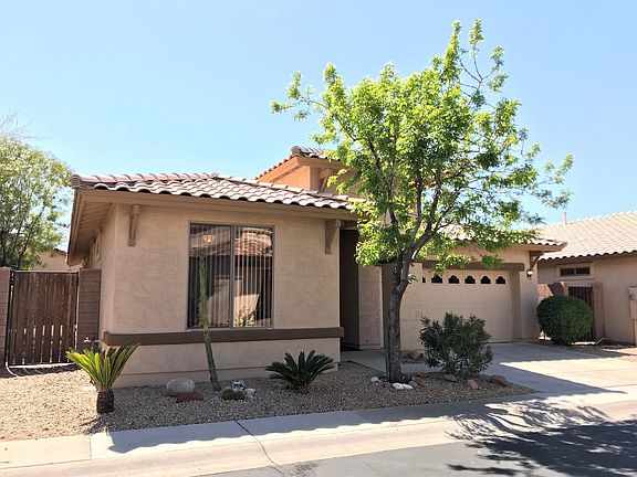 This immaculate home is a GEM in the Suncrest gated community (within Augusta Ranch Golf Club Community) w/ community pool & heated spa. Light bright open floorplan w/ vaulted ceilings & large windows allowing panoramic views of the BEAUTIFUL BACKYARD RETREAT. Amazing desert backyard w/ pavers, roll down patio shades, landscape lighting, small fountain, orange tree, various cacti & greenery. Kitchen boasts NEW GRANITE countertops w/ Blanco sink & pull out faucet, maple cabinets w/ nickel hardware, gas range, pantry & small computer desk. Master split from other 2 bedrooms for privacy. Master suite includes dual sinks, garden tub, private toilet room & large walk-in closet. Ceiling fans w/ remotes. Exterior recently painted. Community includes 5 parks. Great location near US60 & Loop 202.