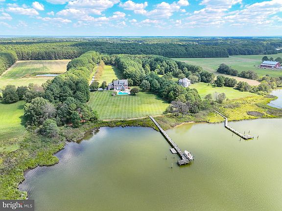 Just 4.9-miles outside historic St. Michaels, MD...Classic "Eastern Shore Waterfront Retreat," featuring a substantial 5,400+ sq. ft. home, thoughtfully designed to capture cooling SW summer breezes and spectacular sunset views across the sparkling waters of Harris Creek. Sited on 8.26 private acres w/over 300' of natural "living Shoreline," features of the brick home include high ceilings (including a cathedral ceiling in the family room and tray ceiling in the primary bedroom); four (or 5) bedrooms; 4 full and 2 half baths; large primary suite w/recently updated bath; gourmet kitchen w/island and breakfast room connected to a wonderful family room w/fireplace. Generous waterside glass to maximize the water views from most rooms. Beautiful waterside swimming pool (heated), surrounded by a very spacious multi-level patio. For Chesapeake bay boating, there is a substantial 6' wide x 200' dock w/electric boat lift. Water depth at the dock on a typical low tide (MLW) is nearly 5 ft. Typical high tide depth, approx. 6.5 ft. This is a great boating, fishing and crabbing location. Tilghman Island waterside restaurants and marinas and the open waters of Chesapeake Bay are just a short, scenic boat ride downstream from the dock. By car, the Town of St. Michaels with its many fine restaurants and attractions is less than 10-minutes away. The house is well-elevated and is NOT in a high risk flood zone (flood insurance not mandatory) and No HOA!