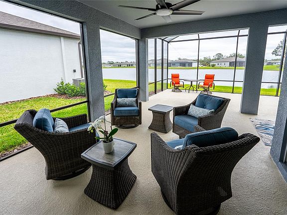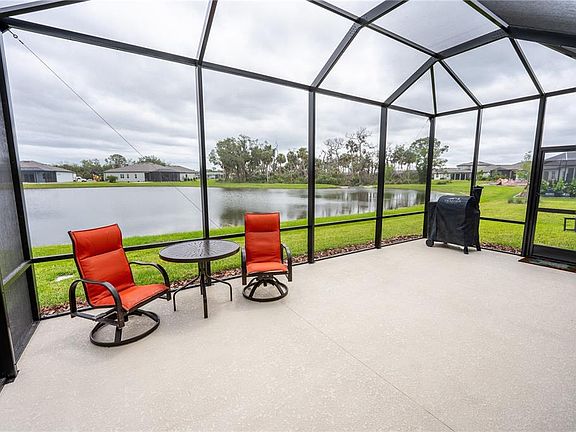 Imaging drinking coffee to gorgeous sunrises with a wide open pond view. To just say this 2/2/3 + flex room is move-in ready does not do it justice. The list of upgrades is extensive, both in the design and post construction. Starting with the designer kitchen, featuring quartz counters, granite sink, built in appliances, under cabinet lighting, gas cooktop, canopy hood, and a walk-in pantry, it is sure to be the heart of many gatherings to come. The open concept is highlighted with three impact sliders in the back, blending your indoor and outdoor spaces together with ample natural light. The screened-in lanai extension was added to make for 626 sq/ft of outdoor space to enjoy the beautiful evenings overlooking the water. Other upgrades include the owner's bathroom, elevation, impact windows, fixtures, LVP waterproof flooring (no carpet anywhere!), tray ceilings, baseboards, laundry room, and french doors for the flex room. For the full list of upgrades please contact your agent or the listing agent. Need storage space? The tandem 3 car garage has a 4' extension with a fresh epoxy coating and the driveway has been widened! When venturing outside your new home, the community offers top notch resort style amenities, including a 24hr fitness center, dog park, pool, spa, tennis and pickleball courts, bocce ball and a full service bar and restaurant! Join the active lifestyle with plenty of community events and clubs to choose from. The area is thriving with quick access to St. Pete, Tampa, Sarasota and world class beaches!