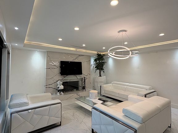 Dual Living Rooms: Two modern living spaces one in crisp white and the other in bold black each featuring a massive marble slab on the chimney for a true luxury feel. Large glass wall in the white living room allows natural light to flood the space.