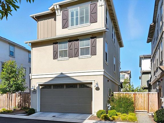 Modern 3-year-new northeast-facing home with 3 beds, 3.5 baths, and fully paid solar. Features a first-floor guest/office suite, chefs kitchen with quartz island and upgraded appliances, and open living to a covered patio. Upgrades include luxury vinyl plank floors, wooden shutters, automatic window treatments, and a garage with epoxy floors and cabinets. Low-maintenance turf yard with built-in deck. Bridgeway amenities: clubhouse, pool, dog park, playground. Prime location near Wildlife Refuge, Meta, Tesla, Dumbarton Bridge, and I-880.