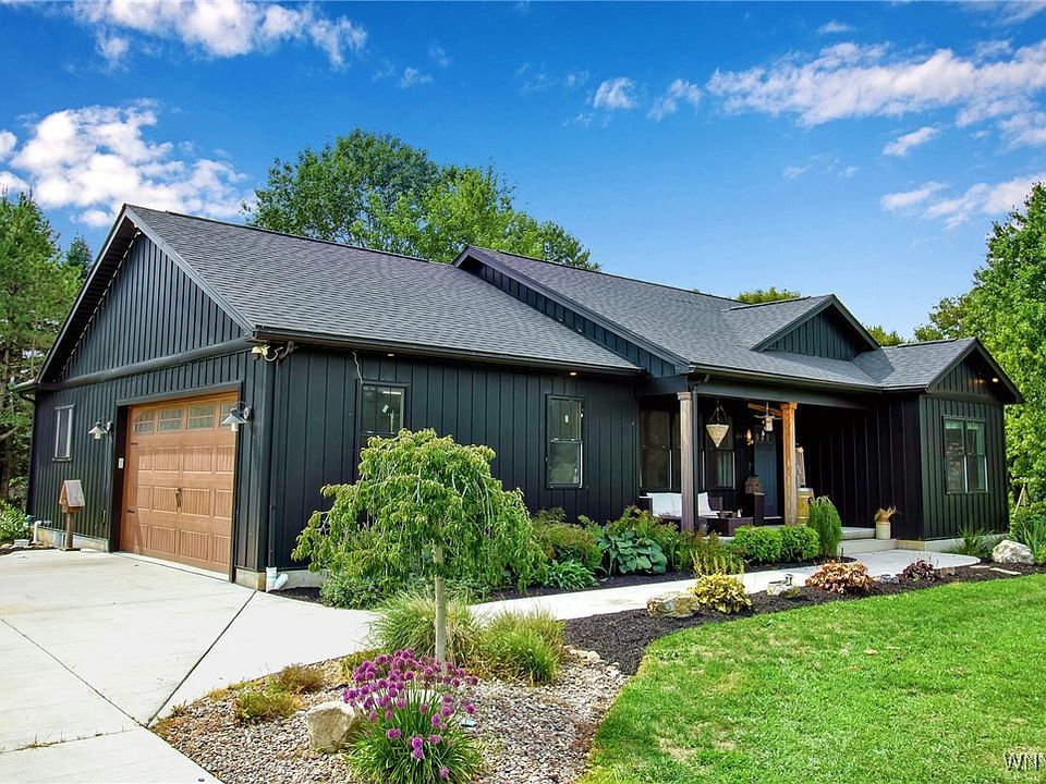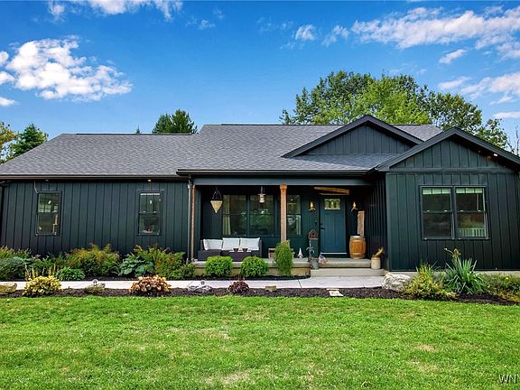 MUST SEE!!! Spacious & remarkable newer-built ranch with designer luxury finishes beautifully set on 1.48 acres where privacy abounds with highly rated Akron schools. Featuring a high-end kitchen with custom 36” Hickory hardwood soft-close cabinetry with glass paneled doors, distinctive Quartz counters, white farmhouse sink opening to the expansive family room with vaulted ceilings, exposed barnboard beams for added character with recessed lighting and stunning luxury vinyl plank floors throughout. With an open layout concept & an abundance of natural light, this desirable home has the primary bedroom suite with bathrm dual vanity and LVT flooring on one side of the home with the two other bedrooms and full bath conveniently situated on the opposite for privacy and relaxing summer evenings. Beautifully appointed exterior is professionally manicured with a pond and covered front porch, perfect for sipping your morning coffee, and a serene backyard oasis complete with a covered concrete patio and outdoor wood boiler system that can be used in place of propane for heating. Live worry free with the on-demand Laars multi-zone water heater and in-floor radiant heating, 200 amp electrical, 1st floor laundry, forever metal siding & architectural shingles for years of peace and ease of living. Meticulously maintained & tastefully built, this charming home rests on a peaceful street with low taxes, great schools yet still close to the conveniences of the Village of Akron! Square footage is from owner and showings start Wednesday, 9/3/25.