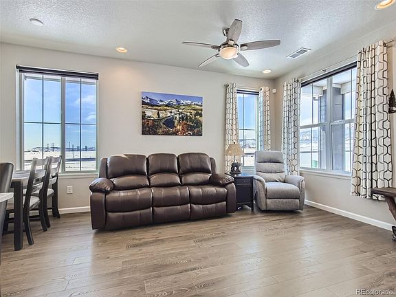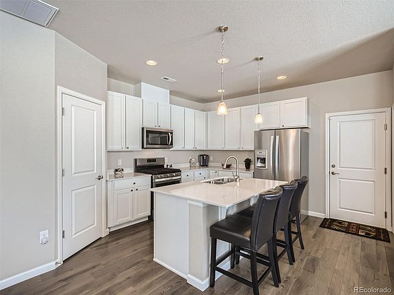 Welcome home! You will love this spectacular 2-story 3-bedroom town home in the highly sought-after Candelas neighborhood. This town home has a prime location and is an end unit giving it mountain views from almost every room. Kitchen includes quartz counter tops, whirlpool stainless steel appliances, an upgraded gas-range, large kitchen island with single chrome pull out sprayer and a spacious pantry. Durable vinyl plank flooring and automatic Hunter Douglas blinds throughout the main level. Upper level includes a master suite with incredible mountain views. Master bathroom comes equipped with marble counter tops, dual sinks, a walk-in shower with upgraded European shower door, and walk-in closet. Additional bedrooms with plenty of natural light and closet space. Upper level laundry room with upgraded whirlpool large capacity washer and dryer. Upgraded carpet and pads, manual Hunter Douglas blinds, and Hunter ceiling fans throughout the upper level. Attached 2-car garage equipped with a 220-volt outlet for the electric vehicle to charge overnight. The community includes six different outdoor parks that include various activities along with miles of trails for hiking, biking and walking. Restaurants, coffee, brewery within walking distance. Walking distance to Three Creeks K-8 School.