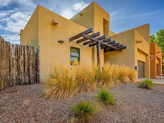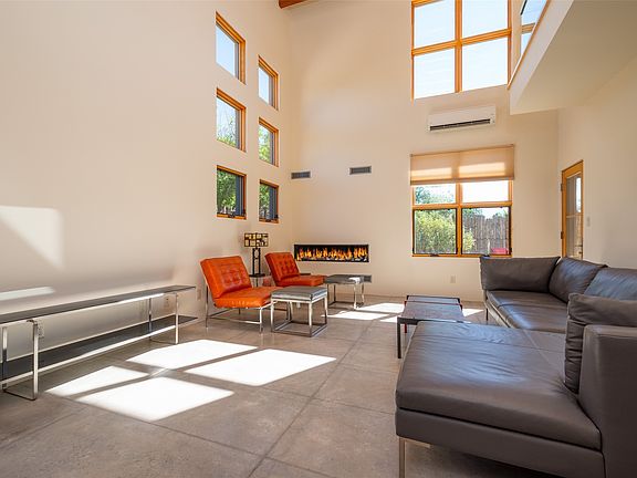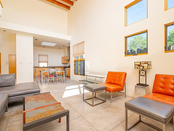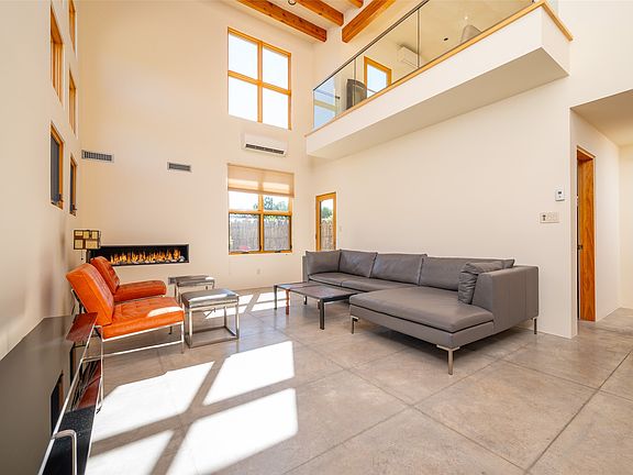 Nestled by the Santa Fe River Walk, this contemporary condo boasts 2 beds, 2.5 baths, and chic concrete floors. The airy layout, gas fireplace, and cathedral-beamed ceilings exude modern elegance. The primary suite on the ground floor flaunts a roomy walk-in closet with built-in shelves. Upstairs, discover a generous entertainment/bonus space, storage and guest suite. The bonus room opens to a balcony framing the Sangre de Cristo Mountain vistas. The guest suite leads to a spacious balcony with captivating western views. Enjoy heating and cooling comfort with 4 mini-split units, radiant floor heat, and a 2-car garage featuring built-in storage on two walls. Elevate your living experience with this extraordinary residence. County Assessor shows the square footage at 1633 which differs from the floor plan provided. Neither Listing Brokers nor Seller warrants the square footage of the home or lot. If the size of the home or lot is of material consideration to the Buyer, then the Buyer should have them measured. Tax Levy is from the Assessor website. All fires depicted are photo-shopped. Buyer to verify the functionality of the fireplaces.