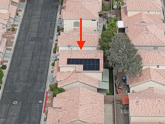 Welcome to this energy-efficient Las Vegas home, perfectly situated in a centrally located, gated community. Fully owned solar panels that convey with the sale! This 2-bedroom gem, with a versatile open loft overlooking the living room, boasts a thoughtful floor-plan. Soaring vaulted ceilings create an airy ambiance, while the well-appointed kitchen offers ample cabinetry and plenty of countertop space, ideal for culinary enthusiasts. The downstairs bedroom, accompanied by a full bathroom, provides flexibility for guests or multi-generational living. Upstairs, the spacious primary bedroom serves as a serene retreat. Step outside to a private backyard patio with low-maintenance artificial turf, backyard lights, and lemon tree perfect for relaxation or entertaining. Additional highlights include owned solar panels, ensuring energy savings. Residents enjoy access to a community pool and park, enhancing the vibrant lifestyle this neighborhood offers. Don’t miss the opportunity!