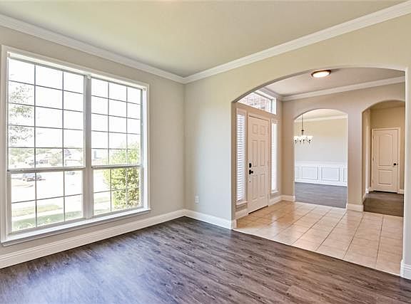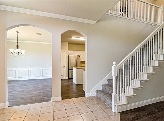 This spacious two-story home is ready for move-in! You'll love the brick, wood burning fireplace, arched doorways and rounded corner walls. The master suite is spacious with a sitting-reading area. The master bathroom has a garden tub, separate shower and dual vanities. This kitchen is equipped with an island, electric stove and includes a refrigerator!