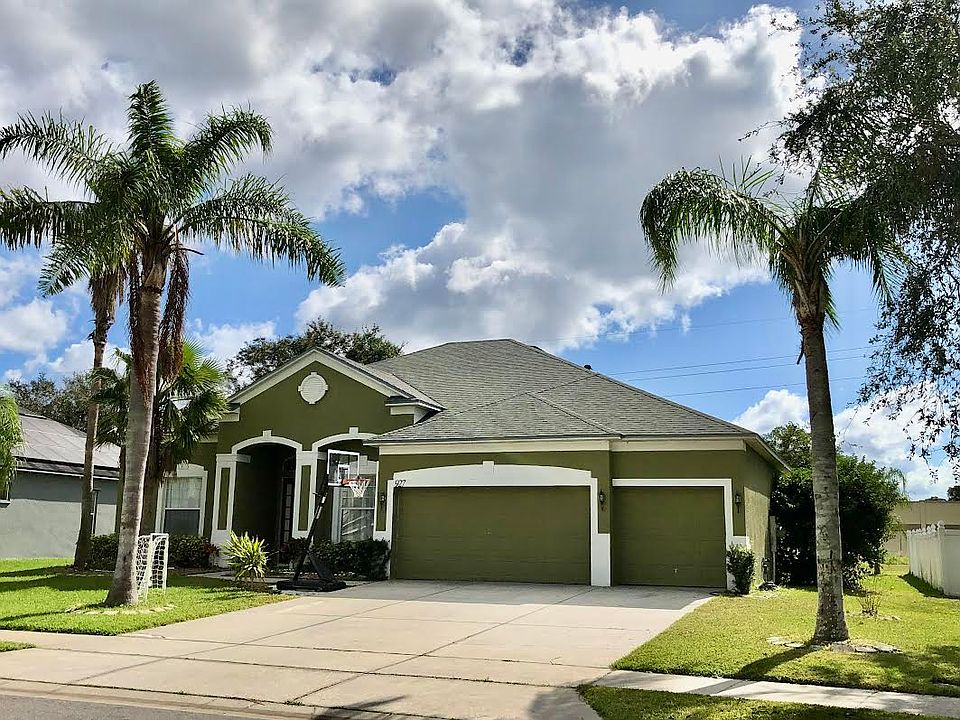 This home has a modern suburban style with a warm olive-green exterior and white accents that highlight its architectural details. It has a prominent three-car garage with matching green doors framed in white, giving it a cohesive look. The house is set on a well-maintained lawn with tropical landscaping, including palm trees that give it a Florida or coastal vibe. The roof has a simple, sloped design, adding to the house's streamlined appearance. In the driveway, there's a basketball hoop, which suggests it's a family-friendly home with space for recreation. The arched entrance and decorative molding add a touch of elegance, making this home inviting and stylish. This house is also close to grocery stores and a hospital for great comfort.