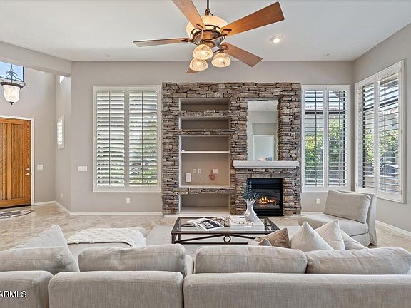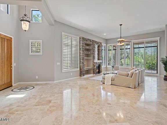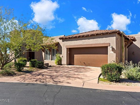 Located within the guard-gated neighborhood of DC Ranch Country Club, this charming single level townhome sits in a quiet cul-de-sac, and has a sunny south-facing patio overlooking the lush grassy common area. The spacious great room offers a tiled mosaic entryway, travertine floors, a stacked stone fireplace/media wall, and a slider that provides access to the back patio. Open to the great room, the kitchen has granite countertops and backsplash, KitchenAid appliances, upgraded cabinets, a freestanding island, and dining available at both the breakfast bar and breakfast nook. The spacious primary bedroom offers a separate access to the outdoor living area, and the ensuite bathroom features dual vanities, a jetted tub, separate shower, and a large walk-in closet. Through a permitted renovation, a courtyard between the main home and the former casita was enclosed, creating an office/flex space and incorporating the former casita into an interior bedroom, thereby creating a true 3 bedroom + den, 3-bathroom home. Outside, the private paver stone patio with custom water feature and built in barbeque is the perfect setting to enjoy daytime sun and evening sunsets. This unit is located steps away from the neighborhood pool, spa and fitness room, and just a 10-minute walk to Market Street, with 8 restaurants, boutique shops, as well as everyday amenities. Enjoy over 33 miles of community paths and trails through the DC Ranch community, as well as Desert Camp Community Center, currently under renovation, which includes a fitness room, adult lap pool, kid's splash pool, tennis and pickleball courts, sport courts, kids' playground and grassy play area.