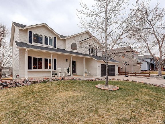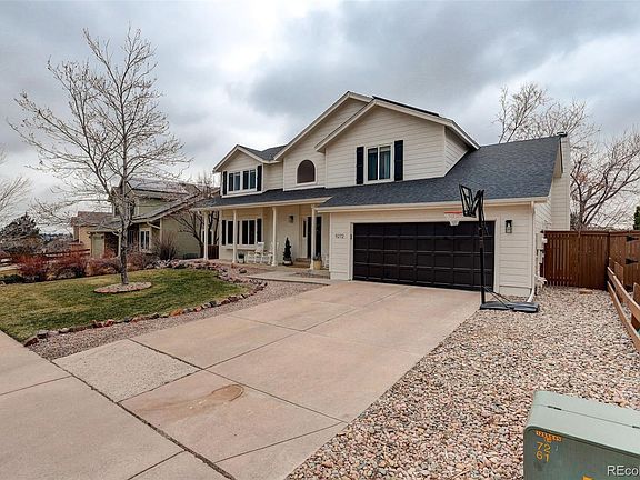 Welcome to your new home in the desirable NorthRidge neighborhood of Highlands Ranch near Springer Park and trails. This beautifully updated 5-bed, 4-bath home is ready for you to move in and make it your own. From the moment you arrive, you'll be impressed by the curb appeal with new exterior paint and a welcoming front porch. As you step through the front door, you are greeted by a grand entryway featuring a beautiful stairway with wood treads and wrought iron balusters. The elegantly appointed living space exudes both style and durability with LVP flooring through-out. The living room features a cozy window seat, perfect for curling up with a good book. The heart of the home is the remodeled kitchen, a chef's dream with its copper sink, granite counters, subway tile backsplash, and stainless-steel appliances. The breakfast nook is ideal for casual meals, while the adjacent dining room offers a more formal setting for gatherings; a perfect place to create memories. A cozy family room with wood insert fireplace and vaulted ceilings, creates a warm and inviting atmosphere. Upstairs, the primary bedroom is a serene retreat with a vaulted ceiling, window seat, and a luxurious en-suite bathroom featuring a double vanity, designer tile shower and walk-in closet. Three additional bedrooms on this level with ceiling fans provide ample space for family and guests. The finished walk-out basement is a versatile space, offering a family room, bedroom, and beautiful full bath, as well as a dry bar with a beverage refrigerator, perfect for entertaining. The private backyard is a tranquil oasis, featuring an extended stamped concrete with an included long table. The deck and covered patio under it provide additional outdoor living spaces to enjoy the Colorado weather. With a new roof, gutters, attic ventilation, exterior paint, and a high-efficiency furnace, this home offers peace of mind for years to come. Don't miss this opportunity to make this your home! Solar to be assumed.
