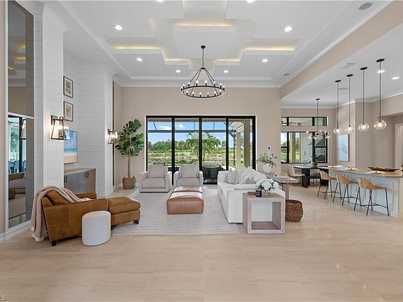 FULL GOLF MEMBERSHIP INCLUDED – EXPERIENCE THE ULTIMATE ESPLANADE LIFESTYLE! A rare offering, this impressive STOCK former model home is one of only 42 Stock-built residences in all of Esplanade. Perfectly positioned on a spacious one-third acre (112’ wide) homesite, this residence boasts 4 bedrooms plus den, 4.5 baths, a 3-car garage, and 3,578 sq. ft. under air. Nearly every room is graced with sweeping water and golf course views, while the sought-after western rear exposure fills the home with natural light and daily sunset vistas. Enter through striking wrought iron double doors into a stunning Great Room floorplan with 15' ceilings, expansive 10’ pocketing sliding glass doors, and a chef-inspired kitchen featuring an oversized center island, KitchenAid appliances, gas cooktop, and wall ovens. The resort-style outdoor living area invites relaxation with a custom saltwater gas-heated pool and spa, framed by a luxurious marble deck and panoramic views of the fairways and lake. Sophisticated upgrades include: Hurricane-impact windows and doors; Whole-house generator; Air-conditioned 3-car garage; Tile flooring in living areas, wood flooring in bedrooms; Custom built-in cabinetry and closet systems; Plantation shutters & designer window treatments; Special-order chandeliers and extensive recessed lighting; in-ceiling sonos speakers; ultra-violet light air purification system; whole house water softener and purification system; new pool GAS pool heater (2024); and more! This extraordinary home offers the perfect balance of elegance, comfort, and resort-style living—enhanced by the included full golf membership in one of Naples’ most coveted communities. Esplanade Golf & Country Club of North Naples offers a true “Lifestyle Community” with world-class amenities, including a resort pool with cabanas and the popular “Bahama Bar,” tennis, pickleball, bocce, a 14-mile network of bike/walking trails, and an 18-hole private golf course. The impressive 15,000 Sq Ft clubhouse features a restaurant, bar, wine-tasting room, wine lockers, and a Starbucks-style café. Best of all, the property’s landscaping, irrigation, golf membership, and all community amenities are covered under a quarterly fee of just $3,664—no additional fees or memberships required! Don't miss your opportunity to own this exceptional home in one of Naples’ most sought-after communities. Schedule your tour of this stunning home and Esplanade Golf & Country Club today! NON FLOOD ZONE/NO FLOOD INSURANCE REQUIRED/ZONE X!