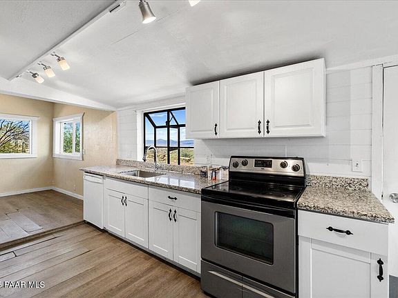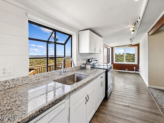 Nestled on 2.35 acres with sweeping views of the Mingus Mountain range, this property presents a rare opportunity for buyers who value space and the tranquility of country living. The home begins with a vaulted foyer filled with natural light from clerestory windows, setting the tone for the bright and airy feel throughout. In the dining area, windows on two sides frame the mountains, creating a warm and inviting atmosphere.The kitchen is both stylish and functional, featuring light-toned granite countertops, crisp white cabinetry, shiplap accents, and a charming garden window that brings in even more natural light. A stainless-steel refrigerator and smooth-top range complete the space.Three bedrooms provide comfortable retreats, while the den with double French doors adds flexibility--ideal for a home office, hobby space, or even a potential fourth bedroom. The bathroom is generously sized and includes a newer vanity along with a garden tub and shower combination. While the home has seen some updates, it is ready for finishing touches, including improvements to the porch, flooring, and general cosmetic details--offering the chance to truly make it your own.Outdoors, the gently sloping acreage backs to a seasonal wash, enhancing the sense of privacy and natural beauty. The property is partially fenced and could easily accommodate one or two horses, goats, chickens, or similar animals. Practical additions include a small storage shed, a 2,000-gallon water holding tank, and RV hookup. The gorgeous deck offers breathtaking views of the landscape surrounding as well.This property is priced with its potential in mind, offering acreage, views, and opportunity for those ready to invest in updates. Whether you're dreaming of a peaceful rural lifestyle, space for animals, or a mountain retreat with room to grow, this could be the perfect fit.