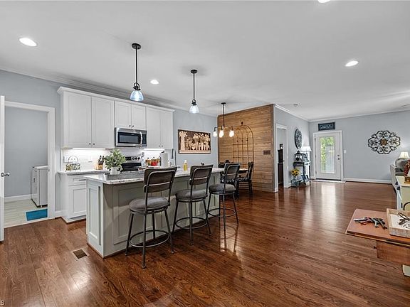 Beautiful end unit, one-level brick townhome featuring 3 bedrooms and 2 full baths. Open-concept layout with loads of post-construction features and upgrades. Including a newly updated walk-in tile shower, designer epoxy garage floor, new storm doors, custom kitchen island, oak floors, bead board, and so much more. The kitchen is a chef's dream with stainless steel appliances, one-of-a-kind backsplash, and quartz countertops. Relax in the large primary suite with ample space and comfort. Enjoy outdoor living on the oversized, private patio. Attached 2-car garage provides convenience and extra storage. The home also features a spacious laundry room with built-in cabinets and a utility sink for added functionality. Ideally located near one of Mebane's quiet pocket parks, historic downtown, hospitals, shopping and dining with easy access to both the Triangle and Triad areas!
